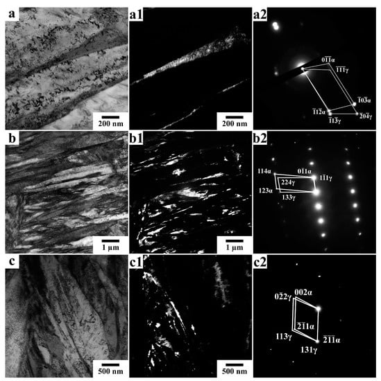Bright-field images (a–c) and dark-field images (a1–c1) of RA and selected area electron diffraction pattern (SAED) (a2–c2) after quenching and partitioning at 350 °C for 600 s (a–a2), 500 °C for 20 s (b–b2) and 500 °C for 100 s (c–c2).