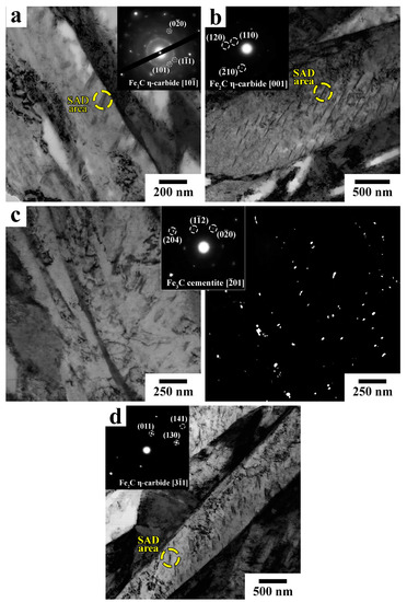 Typical TEM micrographs after Q&P processing (a) partitioning at 350 °C for 600 s, bright-field image and SAED from transition η-Fe2C carbide; (b) partitioning at 500 °C for 20 s; (c) partitioning at 500 °C for 100 s, dark-field image in cementite spot with SAED; (d) partitioning at 500 °C for 100 s, bright-field image and SAED from η-Fe2C carbide.