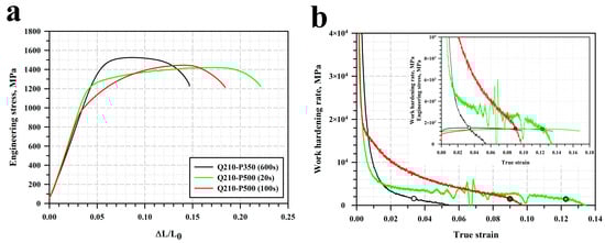 Engineering stress–strain curves (a) and strain hardening vs. strain curves (b).