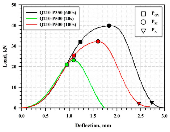 Load–deflection curves obtained during impact tests of the CVN specimens.