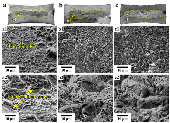 The overall view of fracture surfaces of tensioned specimens after partitioning at 350 °C for 600 s (a); partitioning at 500 °C for 20 s (b) and partitioning at 500 °C for 100 s (c). The enlarged SEM fractographs of the shear-lip zone (a1–c1) and fibrous zone (a2–c2).