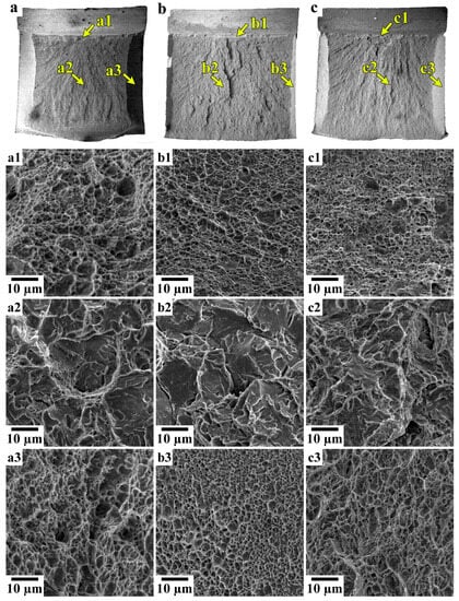 Low-magnification general view (a–c) and high-magnification fractographs of IZ (a1–c1), FCPZ (a2–c2) and SLZ at lateral edges (a3–c3) of the CVN specimens. Partitioning at 350 °C for 600 s (a–a3), partitioning at 500 °C for 20 s (b–b3) and partitioning at 500 °C for 100 s (c–c3).