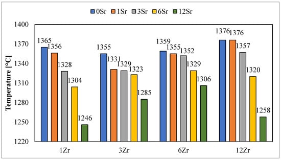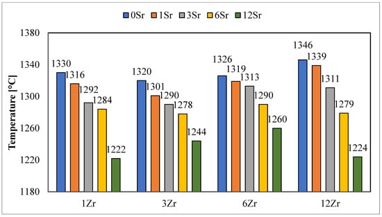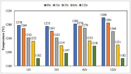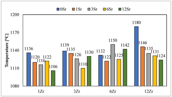 Similar results were observed for the hemispheric temperatures (Figure 3), and with an increase in the amount of strontium oxide added, a decrease in the determined hemispheric temperatures was observed. However, the hemispheric temperature values of glazes with a higher zirconium content have higher values only for glazes without the addition of strontium oxide. The addition of this oxide causes the determined hemispheric temperatures to show a clear upward or downward trend with the higher zirconium content in the glazes. This may indicate that the presence of strontium oxide in the glaze affects the processes that take place, while its fluxing effect is not directly proportional to the amount of SrO added and strongly depends on the chemical composition of the glaze.