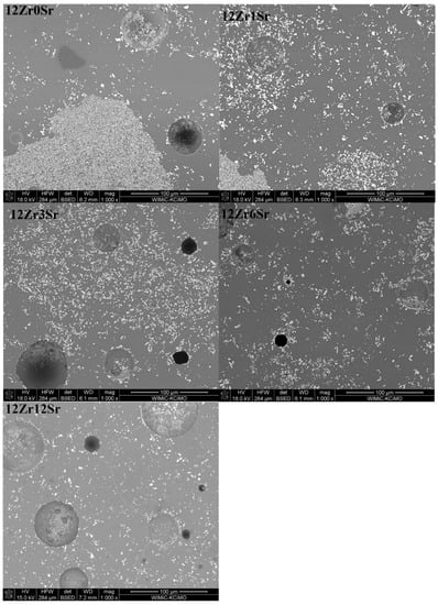 Microphotographs from SEM observations of the 12Zr series (ZrSiO4—light crystals, SiO2—dark-grey spot).