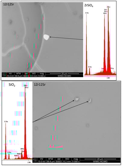 The main purpose of determining the chemical compositions via the means of an EDS analysis of the visible crystallites was to confirm the phase composition. The XRD analysis of the phase composition showed the presence of only two crystalline phases (Table 3), zirconium silicate and residual quartz. The low content of crystalline phases (4 to 18% vol.) made it difficult to find crystallites. The SEM and EDS photos on Figure 9, Figure 10 and Figure 11 presented the 1Zr group with a variable amount (12, 6, 3, 1, and 0% mass) of SrO. All EDS measurements indicate the presence in all sets of only quartz and zirconium silicate. This confirms the XRD results (Table 3). The shell around the SiO2 crystallites confirms the residual form of the quartz crystals; it is a high concentration zone of SiO2 from the melting of the quartz crystals.