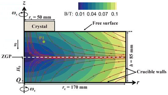 where is the magnetic field intensity, is the crucible radius, and is the axial location of the ZGP. In this study, we examine five different configurations of the CMF in a 100 mm growth system. The location of the zero-gradient position (ZGP) is varied at different heights, namely, h (the melt free surface), , , , and (the bottom of the crucible). Previous research ([,]) has already explored the effects of different axial heights of the ZGP in 300 mm industrial CZ-Si crystal growth. However, our focus here is specifically on investigating the heat and mass transfer process for the different ZGP locations in a 100 mm growth system.
