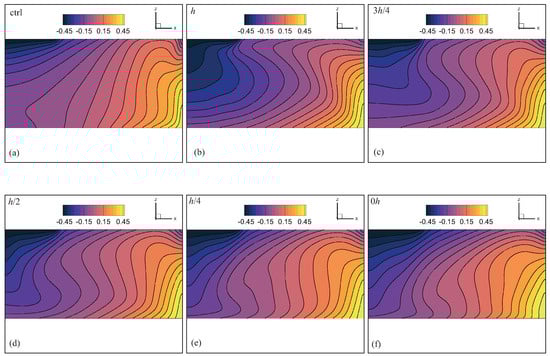 The statistical properties of velocity and temperature represent the overall behavior of the flow and heat transfer process. In order to examine the statistical characteristics of the melt, the velocity and temperature fields were temporally averaged. The cumulative time required for calculating the statistical properties amounts to 600 s (i.e., 50 crucible rotations), which is sufficient for statistical analysis. Additional averaging in the circumferential direction was performed to level out any possible small asymmetries during the time averaging process []. Therefore, the averaged fields were presented in a vertical half-slice of the crucible, with the sidewall located on the right and central axis on the left. Figure 2 shows the calculated time and circumferentially-averaged temperature distributions for different CMF configurations. In Figure 2a, the averaged contour for the control case (i.e., the case without MF) shows that the overall temperature pattern as obtained by the present LES simulation is in good agreement with those reported by Raufeisen et al. [,] and Liu et al. [], with the bulk temperature gradient from the lower edge of the crucible towards the free surface, the center, and the top driving the buoyant flow. There are four major convection rolls in the bulk melt (refer to Figure 3a). When the ZGP position moves down, the isotherms in the central melt region become more evenly distributed and the downward cooling plume originating from the growth interface occupies almost half the bulk melt, which can be verified by the flow patterns shown in Figure 3b–f.
