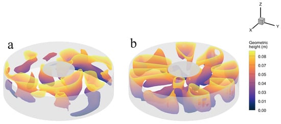 In the absence of MF, the buoyant plumes depicted in Figure 4a show a rather complex turbulent structure of the melt convection, with irregular shapes of hot islands [] at the free surface. The buoyant plumes are illustrated by isosurfaces of temperature difference (defined by , where and respectively denote the instantaneous and mean temperature). Similar isosurface structures were obtained by Raufensen et al. [] and Cen et al. []. For comparison, the isosurfaces in the presence of CMF are plotted in Figure 4b. In the presence of CMF, the buoyant plumes even break into smaller vortical structures, as shown in Figure 4b. Each buoyant plume exhibits a uniform size and assumes the form of a regular teacup shape. These diminutive buoyant plumes congregate in a quasi-axisymmetric arrangement around the crystal. Compared with the case of no MF, the buoyant plumes generally become less turbulent, with lower values of the temperature fluctuations and fewer thermal spikes (see Figure 5). This indicates that the imposition of a CMF can result in the suppression of turbulent temperature fluctuations, which is beneficial for mitigating the formation of striations.
