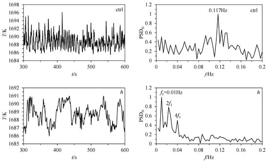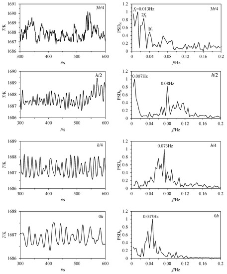 Thermal waves are consistently observed on the free surface when the fluid convection undergoes a transition from steady to oscillatory in a small shallow annular pool []. When the CMF is applied, thermal waves with regular shapes are likely to appear []. Figure 5 displays the time series of the temperature and their spectra for different CMF configurations. When the ZGP is located at and h, the frequencies of temperature oscillation in the melt primarily consist of a reference frequency (denoted by ) and a series of frequencies that are multiples of it. The corresponding reference frequencies for the cases of ZGP = h and ZGP = are 0.013 and 0.01 Hz, respectively. Similar reference frequencies have been reported by Ding et al. [], in which the reference frequency was found to be related to the thermal buoyancy vortex in the melt. In addition, the primary reason for temperature fluctuation in close proximity to the growth boundary is axial heat transfer beneath the crystal, as explained by Ding and Liu []. However, when ZGP is located at , , and , the corresponding spectra show that there are no multiple frequencies referring to a certain primary frequency. This indicates that there is no obvious regularity in the oscillation for these ZGP locations.