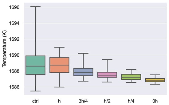 The temperature oscillation characteristics near the growth interface are shown in Figure 6. As the ZGP position decreases from h to , the presence of CMF affects the average temperature at the monitoring point. Comparing the situation without CMF, it is observed that the average temperature gradually decreases from 1688.8 K (the ctrl case) to 1686.89 K (the case). In addition, the temperature fluctuations exhibit a decreasing trend from 2.32 K (the ctrl case) to 0.4 K (the case), suggesting that CMF effectively reduces the temperature oscillation near the growth interface.