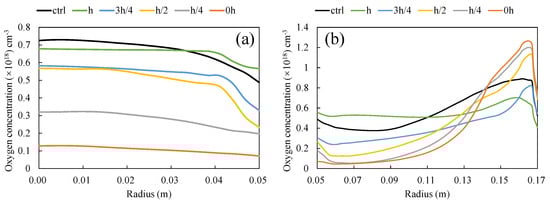 The position of the ZGP is a key parameter of the CMF, and its impact on heat and mass transfer needs to be thoroughly investigated []. When the ZGP position is adjusted, the magnetic field undergoes changes, resulting in variations in both the direction and intensity of the Lorentz force. As the ZGP is gradually moved downward from the free surface, changes in velocity, temperature, and oxygen concentration are observed in the melt (refer to Figure 2, Figure 3 and Figure 9). Figure 7a illustrates the radial distribution of the oxygen concentration averaged in the circumferential direction as extracted from the six different CMF configurations. From Figure 7a, it can be observed that the level of oxygen concentration along the growth interface decreases as the ZGP moves towards the bottom of the crucible. In most of the cases studied, the level of oxygen concentration at the growth interface is lower when the MF is present. An exception to this is the case of ZGP = h, where a slightly higher level of oxygen concentration than the control case was observed near the periphery of the crystal edge. In the absence of MF, the melt convection inside the crucible is highly intensive and the vortical structures are complex, resulting in increased transport and incorporation of oxygen into the growth interface. Among the current configurations, the ZGP = case exhibits the lowest oxygen concentration level and the most uniform radial distribution along the growth interface. As shown in Figure 6, the ZGP = case yields the smallest magnitude of temperature fluctuations near the growth interface. It is widely recognized that the oxygen in the melt originates from oxygen dissolution at the interface between the silicon melt and the crucible. The oxygen is primarily dissolved at the bottom of the crucible, then transported through thermal convection to the free surface and the vicinity of the solid–liquid interface. Figure 8 clearly demonstrates that the radial velocity gradually increases at the bottom of the crucible as the ZGP position moves from h to . Additionally, the horizontal convective flow rate of the melt near the bottom of the crucible is highest at the position for the CMF cases. With the presence of CMF, the majority of the dissolved oxygen from the crucible bottom is carried to the free surface and evaporates, while only a small amount is transported to the crystallization zone. From Figure 7b, it is evident that the ZGP = case exhibits the highest level of oxygen concentration at the crucible edge on the free surface, leading to increased oxygen evaporation and reduced oxygen transport towards the growth interface. Consequently, it can be concluded that the oxygen primarily volatilizes at the free surface and that the counterclockwise vortex induced by the CMF flows inward from the free surface to the crystal–melt interface, resulting in a region of low oxygen concentration near the interface. To quantify the dissolution and amount of incorporated oxygen in the six cases, the dissolution and amount of incorporated oxygen in the six cases are compared in Table 2. It is observed that only of the dissolved oxygen is incorporated into the crystal in the ZGP = case.