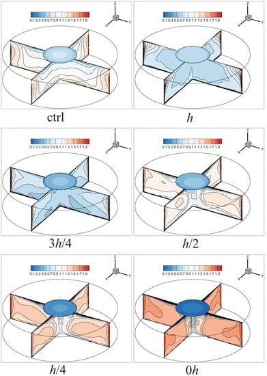When the ZGP is located at h and , it is observed that there is one dominating convection roll in the bulk melt (Figure 3b,c). The roll center is located at the middle of the radial direction. As the ZGP position moves down further, the major convection roll is maintained, with its center moving up towards the free surface (refer to Figure 3d–f). The major convection roll stretches along the crystal edge and the lower corner of the crucible wall, resulting in the enlargement of the counter-rotating vortex at the upper crucible wall. For the ZGP = case, it is observed that the vortical structures (with several small vortical rolls beneath the growth interface) are more complex than those of the other ZGP positions. This phenomena is attributed to the competition between the buoyancy, Lorentz, centrifugal, and Coriolis forces, resulting in the reappearance of the Taylor–Proudman cell beneath the growth interface, as in the case of no MF.