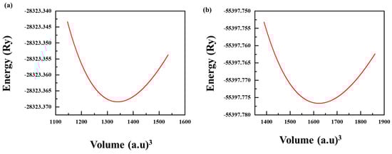 Total energy with volume optimization curves for (a) RbSnBr3 and (b) CsSnBr3.