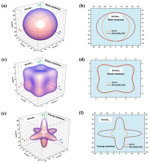 (a,b) 3D representations of the crystal direction dependency of the Bulk modulus (B, in GPa), (c,d) shear modulus G and (e,f) Young Modulus (Y) for RbSnBr3.