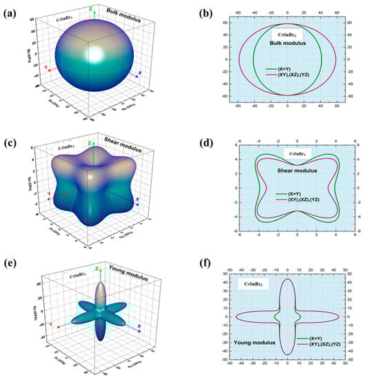 (a,b) 3D representations of the crystal direction dependency of the Bulk modulus (B, in GPa), (c,d) shear modulus G and (e,f) Young Modulus (Y) for CsSnBr3.