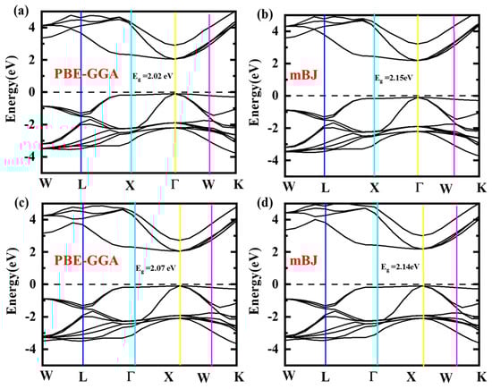 The predicted results for the band structure are displayed in Figure 5, which demonstrate the presence of the EF valence band VB below the Fermi energy. The bandgap is calculated taking into account a number of approximations, including GGA-PBE and mBJ. In comparison to alternative approximations, the computed bandgap taking into account mBJ is found to be 2.07 eV and 2.14 eV higher and can therefore be taken as being equivalent to the experimental value.