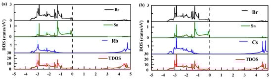 The elemental contribution for the studied XSnBr3 (X = Rb/Cs) is advocated from the density of states plot (DOS) as represented in Figure 6a,b. The Fermi level, which is calibrated to be at 0 eV and can be shown to be near the valence band in both compounds on the band plots, suggests that the material is a p-type semiconductor. The valence band at the Fermi level is produced by the combination of the Rb/Cs and Sn states [52]. As shown in Figure 6a,b, the conduction band formed through the hybridization of Rb/Cs and Br with an Sn atom contribution. Table 3 lists the evaluated effective masses for XSnBr3 (X = Rb/Cs) in the high symmetry primary directions of the Brillouin zone. Understanding the effective masses (m*) of carriers (holes and electrons), which are greatly impacted by resistivity, carrier mobility, and optical response of free carriers, is essential for increasing photovoltaic characteristics [53]. It can be computed from band structure En(k) as