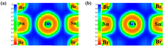 The electron localization function (ELF) [54] for XSnBr3 (X = Rb/Cs) is projected on the (110) plane, as seen in Figure 7a,b. We used the ELF to look for atom-to-atom bonds in XSnBr3 (X = Rb/Cs) compounds. Figure 7a,b imply that the Rb/Cs-Sn, Sn-Br bonding are covalent. As seen in Figure 7, the electron cloud of Br is red, suggesting accepting the electrons from the other network. The Bader charge analysis depicted in Table 3 leads to additional support for this. The fact that Br can accept electrons from Rb/Cs and Sn supports the idea that it is an ion. Switching Rb to Cs has a significant effect on Bader charges, as represented in Table 3. The Bader charge increases with the increase in atomic number and probably due to the increase in states [55].