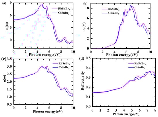 Figure 8a,b represent the variation of ε1(ω) and ε2(ω) with photon energy. Interaction of the light with the material results in polarization, quantified by ε1(ω), as well as the loss of energy because of light dispersion, given by ε2(ω). At zero energy, ε1(ω) is quantified by ε1(0). It is noticed that with the variation of the atom Rb to Cs, ε1(0) increases with the more polarizing nature of the larger atoms, in accordance with Penn’s model (i.e., ε1(0) = 1 + (hωp/Eg)) that is inversely linked to the bandgap [57]. After ε1(0), the graph shows the variation with the number of peaks that are commonly known as relaxation peaks. These peaks are useful in the determination of the relaxation frequency. However, due to the inverse relation between the relaxation frequency and total mass of the oscillating atoms, these peaks are observed to move towards lower energy [41]. The primary peaks in the ε1(ω) plot are observed in the visible region. By employing the relationship n2(ω) = ε1(ω), the refractive index can be computed. As observed in Figure 8c, the n (ω) plot is similar to ε1(ω). The calculated values of n(ω) are illustrated in Table 4. Figure 8b represents the variation of ε2(ω) with incoming radiation. The optical bandgap, as well as the absorption characteristics, are represented by ε2(ω). It is noticed that no absorption is achieved up to 2.06 eV and 2.11 eV for XSnBr3 (X = Rb/Cs) with validating the optical bandgap, which is approximately equal to the electronic bandgap. The reflectance R(ω) of the XSnBr3 (X = Rb/Cs) over the energy range of 0 eV to 10 eV is exhibited in Figure 8d; XSnBr3 (X = Rb/Cs) exhibits normal semiconducting properties with reflectivity less than 0.6. The measurement of reflectance at zero energy is known as absolute reflectivity, or R(0). Table 4 displays R(0)’s magnitude. After R(0), the reflectivity increases and decreases when it reaches its maximum value. The detailed investigation of optical properties reveals exceptional photoelectric capabilities, indicating enormous potential for utilization in the absorber layer of a solar cell.