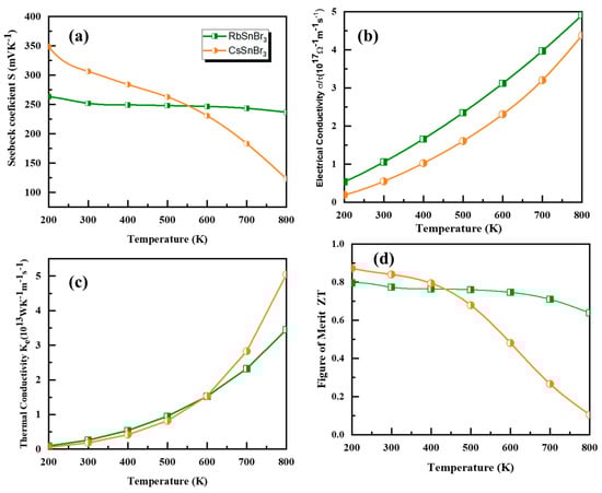 Semiclassical Boltzmann theory is used to examine the thermoelectric properties of the tested XSnBr3 (X = Rb/Cs) HHs while taking constant time relaxation time (τ) into consideration. The Seebeck coefficient (S), thermal conductivity (κ/τ), and electrical conductivity (σ/τ) are taken into account. The Seebeck coefficient (S) is regarded as a crucial consideration when examining thermoelectric (TE) qualities. Higher Figure of Merit (ZT) values, which indicate a material’s suitability for thermoelectric applications, are preferable to lower Seebeck values. The Seebeck coefficient (charge and heat) is related to the electron carriers. The Seebeck coefficient must be high for the thermoelectric performance to be optimum. It is positive for p-type materials but negative for n-type materials [58,59]. The investigated compound is p-type as evidenced from Figure 9a. S values for the investigated XSnBr3 (X = Rb/Cs) compounds at room temperature were 249 μV/K and 298 μV/K, respectively, as indicated in Table 4. The valence electrons become less tightly bound and need less energy as the ionic scale rises from Rb to Cs. The quantity of free charge carriers increases along with electrical conductivity as well. This is due to the possibility that the potentials preserved across the sample edges may drop as the bandgap closes, and the number of free charge carriers rises at lesser exciting energies, much to how S declines as an atom moves from Rb to Cs.