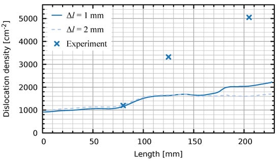 - Bános, N.; Friedrich, J.; Müller, G. Simulation of dislocation density: Global modeling of bulk crystal growth by a quasi-steady approach of the Alexander–Haasen concept. J. Cryst. Growth 2008, 310, 501–507. [Google Scholar] [CrossRef]