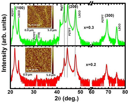 Figure 1 shows the room temperature X-ray diffraction (XRD) pattern of the PZTFTx/LSCO/MgO thin films measured in a 2θ range from 20 to 80 °. The sharp reflection peaks of the diffraction pattern suggest the crystalline nature of the grown thin films. The structure of the PZTFTx thin films was determined from an analysis of the XRD data. These thin films are in a single phase and stabilized in the orthorhombic phase [12], with nearly (100) orientations. Though weak in intensity, the appearance of a (110) reflection peak in the diffraction pattern is discernable. The relative volume of the (110)-oriented phase was estimated to be 0.09% and 0.03% for x = 0.2 and 0.3, respectively. The peak positions were found to slightly shift towards a higher 2θ angle with an increase in x, indicating a reduction in the unit cell volume due to the substitution of the small ionic radii of the Fe and Ta cations. Using POWD software, for x = 0.2, the in-plane orthorhombic lattice parameters a = 4.0438(1) Å and b = 4.0672(1) Å were obtained; the parameters for x = 0.3 are: a = 4.0882(2) Å and b = 4.0698(2) Å. Lattice mismatches among the substrate, buffer conducting layer, and film often build strain in thin films [18]. The lattice strain η in a thin film can be evaluated using the formulation [18] η = (abulk – afilm/afilm) × 100, where η is the lattice strain and abulk and afilm are the lattice constants of bulk and film, respectively. The lattice parameters of the bulk and thin films were considered to estimate the in-plane strain in the films. The thin films x = 0.2 and 0.3 have in-plane compressive strain values of 0.22% and 0.04%, respectively. Hence, in the x = 0.3 thin films, a small amount of strain is found. Atomic force micrographs were obtained on a plane surface area of 5 × 5 µm2 on the thin films, operating in contact mode on a z-scale of 20 nm (inset in Figure 1). The roughness Rq (root-mean-square) of the films obtained from the analysis of the AFM images ranges from 4 to 5 nm. This indicates a homogeneous distribution of grains on the thin films which resulted in a smooth surface.