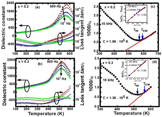 Dielectric constant (εr) and loss tangent (tan δ) of PZTFTx thin-film capacitors measured from 100 to 650 K at several frequencies: (a) x = 0.2; (b) x = 0.3. The reciprocal dielectric constant (1000/εr) versus the temperature of the thin films measured at 10 kHz: (c) x = 0.2; (d) x = 0.3. The respective versus plots are shown as insets.