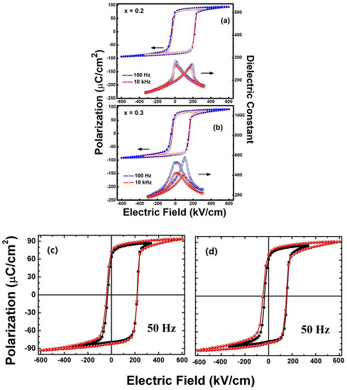 Ferroelectric hysteresis loops and dielectric constants measured as functions of the electric field for PZTFTx thin-film capacitors at an ambient temperature for frequencies of 100 Hz and 10 kHz (a) x = 0.2; and (b) x = 0.3. Room-temperature P-E hysteresis loops of the PZTFTx thin-film capacitors measured at 50 Hz: (c) x = 0.2; and (d) x = 0.3.