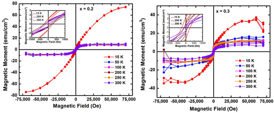 Oxygen stoichiometry is one key factor in determining the magnetic properties of oxides. As mentioned previously, PZTFT thin films were grown and annealed in an oxygen atmosphere; therefore, one can expect a minimal oxygen deficiency in these thin films. To study the behavior of the magnetic ordering in the PZTFTx films, magnetization M hysteresis loops were measured in the magnetic field H in the range of ±70 kOe (in-plane field) at several temperatures from 15 to 300 K. The temperature-dependent magnetization loops for the x = 0.2 and x = 0.3 thin films are shown in Figure 4, which shows discernable, square-shaped magnetic hysteresis loops with saturated magnetization Ms values above 16 kOe, indicating the ferri-/ferromagnetic behavior of the films from 15 to 300 K. In the low magnetic field, the magnetization growth increased and was saturated at a high magnetic field above 16 kOe. Reductions in both the remanent and coercive fields of the M-H magnetization loops are evident with increasing temperatures. For clarity, the zoomed-out M-H magnetization loops seen in the low field (<1 kOe) region are shown as insets in Figure 4. For x = 0.2, at 15 K, the remanent Mr was observed to be 1.3 emu/cm3, and the coercive field Hc was 270 Oe. With the rising temperature, these values continuously decreased to 0.5 emu/cm3 and 160 Oe at 300 K. Similarly, for x = 0.3, at 15 K, the remanent Mr was found to be 2.3 emu/cm3, and the coercive field Hc was 260 Oe. Furthermore, these reduced to Mr ~0.5 emu/cm3 and Hc ~110 Oe at 300 K. Thus, these thin films exhibited ferromagnetic ordering from 15 K to 300 K. Such ferromagnetic behavior was reported in bulk PZTFTx. [12,20] and PZTFT0.4 thin films [18]. The ferromagnetic ordering in these material is inferred through the Fe3+-O-Fe3+ super-exchange ionic interaction established in the material [12,18]. It should be noted that there was a sharp decrease in magnetization after 15 K (Figure 4). The original PbFe0.5Ta0.5O3 (PFT) underwent two anti-ferromagnetic transitions that took place at about 150 K and 9 K [18]. Therefore, the Neel temperature TN related to the PFT can be attributed to this observed anomaly in magnetization. At present, we do not have magnetization data in a closer interval in the range of 15–50 K. A close inspection of the temperature-dependent magnetization data (<50 K) measured in a closer T-interval will be helpful for attaining more clarity about the present observations.
