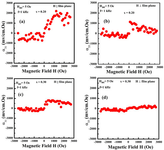 Room-temperature magnetoelectric voltage coefficient αME values versus the bias field H in the x = 0.2 film’s (a) in-plane field and (b) cross-plane field and in the x = 0.3 film’s (c) in-plane field and (d) cross-plane field.