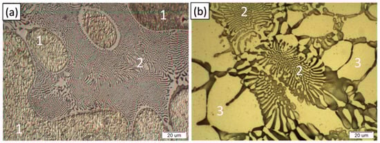 Primary phase and eutectic phase in the Ni–Ni3B alloy: (a) hypoeutectic alloy and (b) hypereutectic alloy. 1—primary phase α-Ni, 2—eutectic phase Ni/Ni3B, 3—primary phase Ni3B.