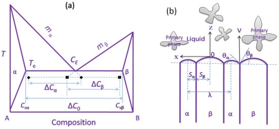 Jackson and Hunt [,] established the first detailed analytical model (JH model) for diffusion-limited growth of regular eutectic as the coupled growth of α and β phases. Then, Trivedi et al. [] extended the JH model to eutectic growth under rapid solidification conditions (TMK model). Taking the interface solute trapping into account, Kurz et al. [] analyzed the failure of local equilibrium at the solid–liquid interface at high growth velocity within the framework of the JH and TMK models.