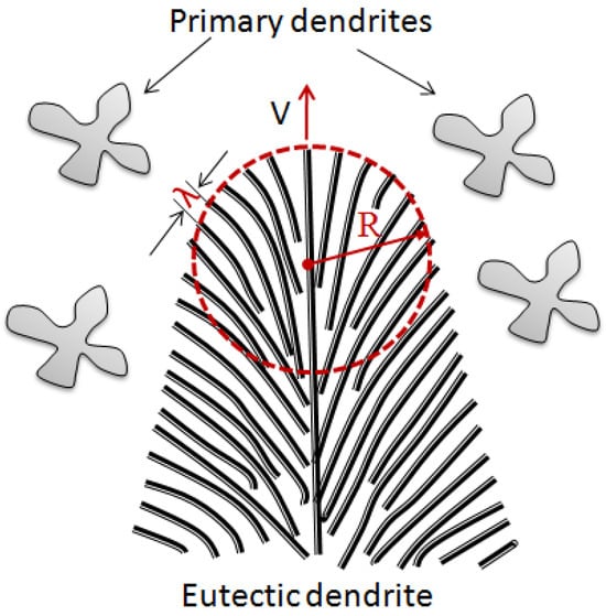Now, consider the macrointerface as the dendritic surface with the dendrite tip radius R, which is much larger than the interlamellar spacing, λ << R (Figure 3). Considering the transition from a eutectic pattern to a eutectic dendrite at high undercooling, the thermal undercooling can be described as