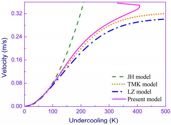 The kinetic curve given by the present model may lie lower or higher than the other models that depend on the value of solute diffusion speed (VD) (Figure 4). If VD is large enough and the solute distribution coefficient is the same as that of the LZ model, then the kinetic curve of the present model becomes the same as that of the LZ model. In the range of small undercooling, the kinetic curves of all models become quantitatively and qualitatively similar due to the smallest growth velocity in comparison with the intensity of the interface and bulk diffusion processes.