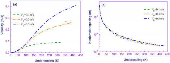 The solute diffusion speed (VD) limits the critical growth velocity for the eutectic reaction from diffusion-limited growth to a diffusionless transition []. Figure 5a shows the ΔT-V curves changing with different VD. It can be found that a smaller VD leads to a lower ΔT-V curve. Figure 5b shows λ-ΔT curves in which the value of VD mainly affects the maximal undercooling but has a small effect on the value of λ. This is due to the smaller diffusion coefficient D, and if V→VD, the lamellar eutectic growth is gradually suppressed in such a case.