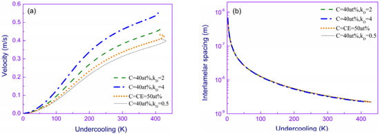 Figure 6 shows the effect of the composition factor kD on the ΔT-V and λ-ΔT curves with a eutectic composition (CE = 50 at.%) and hypoeutectic composition (CE = 40 at.%). For the eutectic composition, kD has no effect on the relation of ΔT-V-λ because kc from Equation (4) is always equal to 1. For off-eutectic hypoeutectic alloys, the results depend on the value of kD relative to 1.