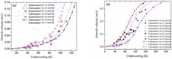 In a comparison of the present model predictions with experiments, Figure 7a shows the experimental results of ΔT-V for different compositions of Ni–B hypoeutectic alloy. The experimental method has been described elsewhere []. In the hypoeutectic alloy (boron content < 16.5 at.% B), the average growth velocity is larger than that of the eutectic alloy (boron content ≈ 16.5 at.% B) in the measured undercooling range. Using the present model Equations (24)–(27), it can be found that the calculated results from eutectic to hypoeutectic composition are consistent with the experimental results if kD = 5 (Figure 7a). Figure 7b shows the experimental data for the ΔT-V relationship obtained in the hypereutectic Ni–B alloy (boron content > 16.5 at.% B). Due to the method used [], the experimental data have a large scatter in a rather wide range of undercoolings. The overall trend of theoretical predictions, however, still shows the trend of experimentally measured data ΔT-V correctly. The average growth velocity of the hypereutectic alloy is also larger than that of the eutectic alloy (boron content ≈ 16.5 at.% B). Using the present model Equations (24)–(27), the theoretical predictions are consistent with the experimental data if kD = 5 (Figure 7b).