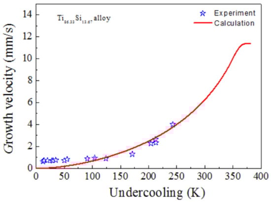 To further show the applicability of the present model, the relationship between the growth velocity and the undercooling of Ti–Si eutectic alloy measured experimentally by Luo et al. [] was used. As shown in Figure 8, the experimental data can be described well in an undercooling range of 50 K to 243 K. When the undercooling is smaller than 50 K, our model disagrees with the experimental data. The reason why we obtained such deviation of the theory from experimental measurements is that the robust accuracy of measurements lies in the undercooling range higher than 40–50 K for electrostatic and electromagnetic levitation methods. Additionally, if the undercooling is higher than 243 K, the growth mode can be drastically changed. Instead of coupled growth of eutectic lamellas, one can obtain strongly irregular eutectics, which obviously cannot be described by the present model.