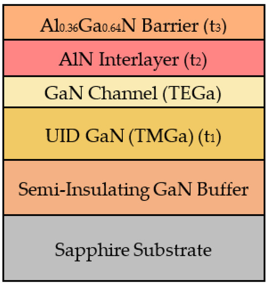 For obtaining a thick and high-composition AlGaN/AlN/GaN HEMT with a low sheet resistance (<250 Ω/□), a series of experiments were performed to optimize the deposition conditions and understand the effect of different deposition parameters on 2DEG mobility. Three different deposition temperatures (1100 °C, 1210 °C, and 1270 °C) were examined initially to obtain the most optimized deposition condition in the GaN channel. Multiple structural parameters were varied—the thickness t1 of the intermediate UID-GaN layer (to understand the effect of the distance of the channel from the deposition surface of the Fe-doped semi-insulating GaN template), the thickness t2 of the AlN layer (to check the effect of alloy scattering), and finally the thickness t3 of the AlGaN layer (to study its effect on the channel resistance). The final epitaxial structure design included the most optimized deposition conditions obtained by varying all of the above parameters. The epitaxial layer structure is shown in Figure 1. The Al composition in the barrier layer was kept constant (36%) throughout the different epitaxial layers to obtain enhanced polarization-induced 2DEG charge density. The composition of the AlGaN barrier layer was kept at 36% to minimize the sheet resistance while depositing the thick barrier layer to avoid the formation of cracks. The strain in AlGaN layers deposited on relaxed GaN continued increasing with the increase in Al composition and thickness, which increases the probability of crack formation [25]; so, in this work, the composition was not increased beyond 36%. Also, it has been reported that an Al composition greater than or equal to 38% reduces the low-temperature (77 K) 2DEG mobility, which signifies increased interface roughness scattering in the channel [26,27]. Deposition parameters are listed in Table 1. The UID GaN thickness (t1) was chosen to reduce the effect of unintentional Fe doping in the UID-GaN layer from the Fe-doped S.I. GaN template, known as the memory effect of Fe in GaN [28,29]. Thus, we have chosen two different thicknesses of UID GaN layers, 200 nm and 1000 nm, for observing the effect of unintentional Fe doping from the S.I. template. The high-composition AlGaN barrier and the AlN interlayer thickness were designed to increase 2DEG mobility and minimize the sheet resistance of the channel. The AlN thickness was chosen as 0.7 nm and 1.2 nm, as a thickness of AlN below 0.7 nm does not reduce the alloy disorder scattering significantly. Moreover, an AlN thickness beyond 1.2 nm will cause micro-cracks in the barrier layer due to increased strain. The AlGaN thicknesses were chosen to be 21 nm and 31 nm for determining the increment in charge density and the effect on 2DEG mobility. An intermediate thickness of 25 nm of AlGaN was also deposited, but due to a drift in the deposition condition the Al composition in the AlGaN layer changed, thus the 2DEG charge density and the mobility values could not be compared to the other samples.