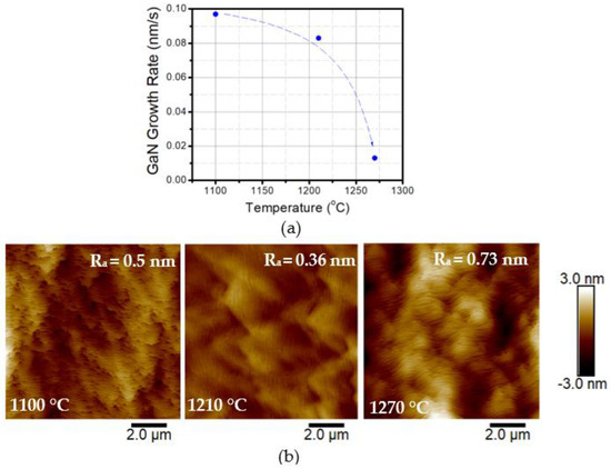 Initially, three different TEGa GaN channel deposition temperatures, 1100 °C, 1210 °C, and 1270 °C, were studied, maintaining the UID GaN deposition temperature using TMGa at 1210 °C. The TEGa GaN channel thickness was kept at 70 nm to obtain the deposition rate from in situ reflectance using Laytec EpiTT. It was observed that, with increasing temperature from 1100 °C to 1270 °C, the deposition rate of GaN continued decreasing from 0.097 nm/s to 0.013 nm/s (Figure 2a). A sharp decrease in deposition rate from 0.083 nm/s to 0.013 nm/s was noticed between 1210°C and 1270 °C, suggesting a desorption-limited deposition regime at 1270 °C. This can affect the overall yield and increase the cost of manufacturing. The surface roughness increased by almost 38% and 102% for 1100 °C and 1270 °C, respectively, compared to 1210 °C (Figure 2b). However, the effect of surface roughness was different at 1100 °C and 1270 °C deposition temperatures. The step bunching was extremely high at 1100 °C, but the surface undulations were lower, whereas at 1270 °C the surface undulations were high but step bunching was minimal (Figure 2b). The possible reason behind the different types of surface roughness is mostly related to deposition kinetics. At 1100 °C, the incorporation of gallium in GaN was high (Figure 2a), but due to lower temperature, the lateral diffusion of the adatoms was affected, causing step bunching. On the contrary, at 1270 °C the Ga incorporation was extremely low (Figure 2a) (almost desorption limited deposition), but the presence of high thermal energy reduces step bunching. Also, increased undulations in the surface indicate a non-uniform deposition of GaN at 1270 °C. The most optimized deposition temperature was found to be 1210 °C, where the surface roughness was minimal but the deposition rate was moderate.