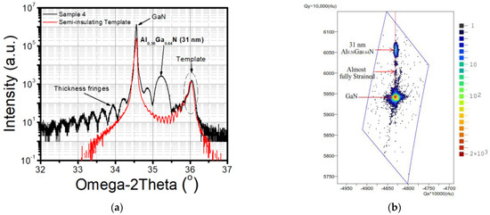 The thickness of AlGaN was measured using an omega-2theta scan (Figure 3a) and the composition of the AlGaN layer was determined using the reciprocal space mapping (RSM) technique (Figure 3b). For the calibration of AlGaN composition and thickness, an AlGaN/GaN super-lattice (SL) structure (repetition 5–10) was deposited with 2–4 nm of AlGaN and 2–5 nm of GaN with different TMAl flows and a fixed TEGa flow rate (15 μmol/min). The GaN deposition rate was determined from the reflectance data obtained from the in–situ reflectance monitoring system during the thick (>100 nm) GaN layer deposition with the same TEGa flow rate. Next, the omega-2theta measurements of the AlGaN/GaN SL layers were performed using XRD and fitted using Panalytical X’pert Epitaxy software to obtain the thickness and composition. Three separate SL structures with three different TMAl flow rates along with a fixed TEGa flow rate were used to obtain a linear relationship between AlGaN composition, thickness, and the TMAl flow rate. After that, a specific TMAl flow rate (4.6 μmol/min) was chosen to obtain 36% AlGaN composition with a TEGa flow rate of 15 μmol/min. The thickness and composition values were further verified via XRR and RSM measurements, respectively. The fittings were performed using Panalytical AMASS 1.0 [34] and X’pert Epitaxy 4.5a [35] software for XRR and RSM measurements, respectively. The measured deposition rate of the AlGaN layer was near 0.14 nm/s. The RSM measured across the GaN (−1–14) reflection shows an almost fully strained 31 nm AlGaN (36%) barrier deposited on GaN with a 0.7 nm AlN interlayer. It also indicates that the AlGaN peak broadening was very low, which signifies high material quality. The AlN layer was deposited using TMAl and NH3 under the same deposition conditions. The thickness (deposition rate 0.05 nm/s) of the AlN layer was determined using a similar calibration method to that described above.