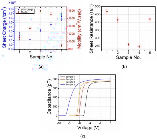(a) 2DEG sheet charge and mobility, (b) sheet resistance, and (c) capacitance−voltage measurement of different samples.