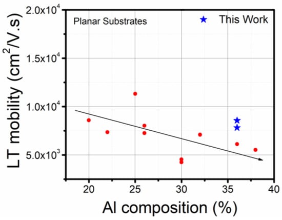 Comparison of low-temperature (LT) (77 K) mobility of 2DEG of AlGaN/GaN HEMT with respect to aluminum composition on planar substrates; references [8,13,15,27,40,41,42,43,44].