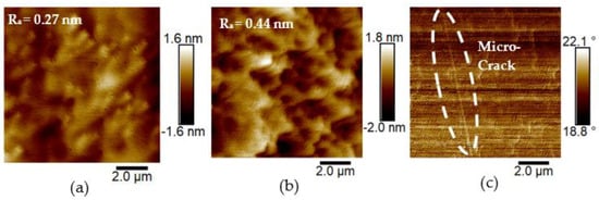 Comparing samples 4 (t2 = 0.7 nm) and 5 (t2 = 1.2 nm), the degradation in RT and LT mobility from 1710 cm2/V·s to 907 cm2/V·s and 7830 cm2/V·s to 3840 cm2/V·s, respectively, could be analyzed partly with AFM scans. In Figure 6a,b, the AFM scans (10 μm × 10 μm) of sample 4 and sample 5 are displayed. The surface roughness increased in sample 5 by 63% compared to sample 4 and more step bunching appeared. Also, Figure 6c shows that there were micro-cracks present in sample 5. Therefore, with a higher AlN thickness (1.2 nm) along with a thicker AlGaN (t1 = 31 nm) layer, the strain in the barrier layer became extremely high and enough to generate micro-cracks in sample 5. So, the degradation in 2DEG mobility in the channel was possibly due to increased interface roughness and therefore a degradation in the interface quality [26,45,46]. The large degradation of the 2DEG mobility in sample 5 can be understood from Figure 6c. Micro-cracks increased the scattering of the 2DEG significantly, thus decreasing the mobility. Further optimization of the deposition process can indeed improve the 2DEG mobility.
