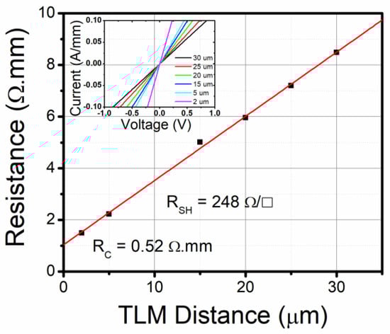 Figure 8 shows the transfer length method (TLM) measurement of the sheet resistance and contact resistance of 0.52 Ω.mm and sheet resistance of 248 Ω/□ of sample 3, which is similar to the sheet resistance obtained from the Hall measurement. The small difference between the Hall measurement and the TLM measurement might come from different contact-formation procedures, where indium contacts were used for the Hall measurement and Ti/Al/Ni contacts were deposited using the e-beam evaporation technique for the measurement of TLM. Also, the Hall measurement may give an average value of the sheet resistance, whereas the TLM measurement provides localized sheet resistance.