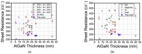 Sheet resistance variation with AlGaN thickness for (a) different Al compositions and (b) different substrates; references [4,7,8,12,13,14,15,26,27,40,41,42,43,44,47,48,49,50,51,52,53,54,55,56,57,58,59,60,61,62,63,64,65,66,67,68,69].