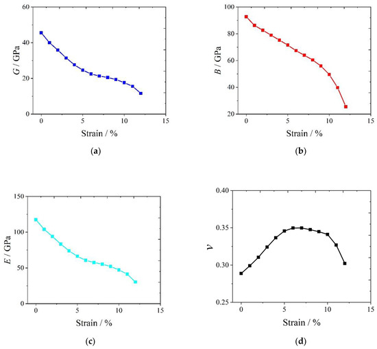 By comparing Figure 2a–d, we can see that as the uniaxial tensile strain εx increased from 0 to 12%, the elastic moduli (G, B and E) of the Al6MgNb compound declined monotonically, but the Poisson ratio ν increased first and then decreased.