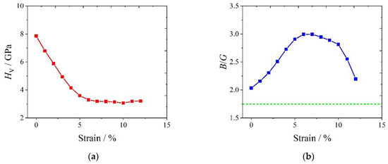 Variation in Vickers hardness HV and ratio B/G of the Al6MgNb compound with uniaxial tensile strain in the x direction (εx): (a) HV vs. strain εx; (b) B/G vs. strain εx.