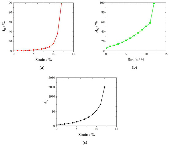Variation in elastic anisotropy indexes of the Al6MgNb compound as uniaxial tensile strain in the x direction (εx): (a) compression anisotropy percentage AB vs. strain εx; (b) shear anisotropy percentage AG vs. strain εx; (c) universal anisotropy index AU vs. strain εx.