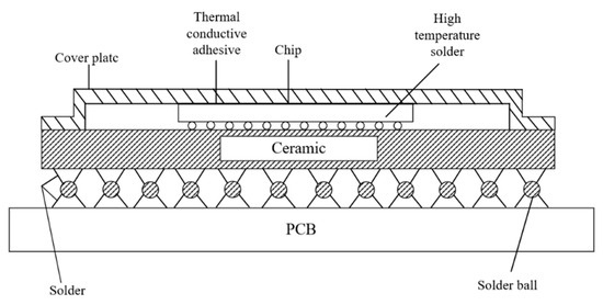Ceramic materials are preferred as they offer excellent properties, including good abrasion resistance, insulating properties, and thermal stability, making them an important material for microelectronic components [7]. Ceramic Ball Grid Array (CBGA) is a type of BGA encapsulation that employs ceramic materials. It has excellent electrical properties, high-density integration, good airtightness, moisture resistance, and effective soldering performance. Due to its remarkable reliability, CBGA is widely utilized in national defense, military, and aerospace sectors, as well as other high-precision special equipment fields. Figure 1 illustrates the typical encapsulation structure of CBGA [8,9].